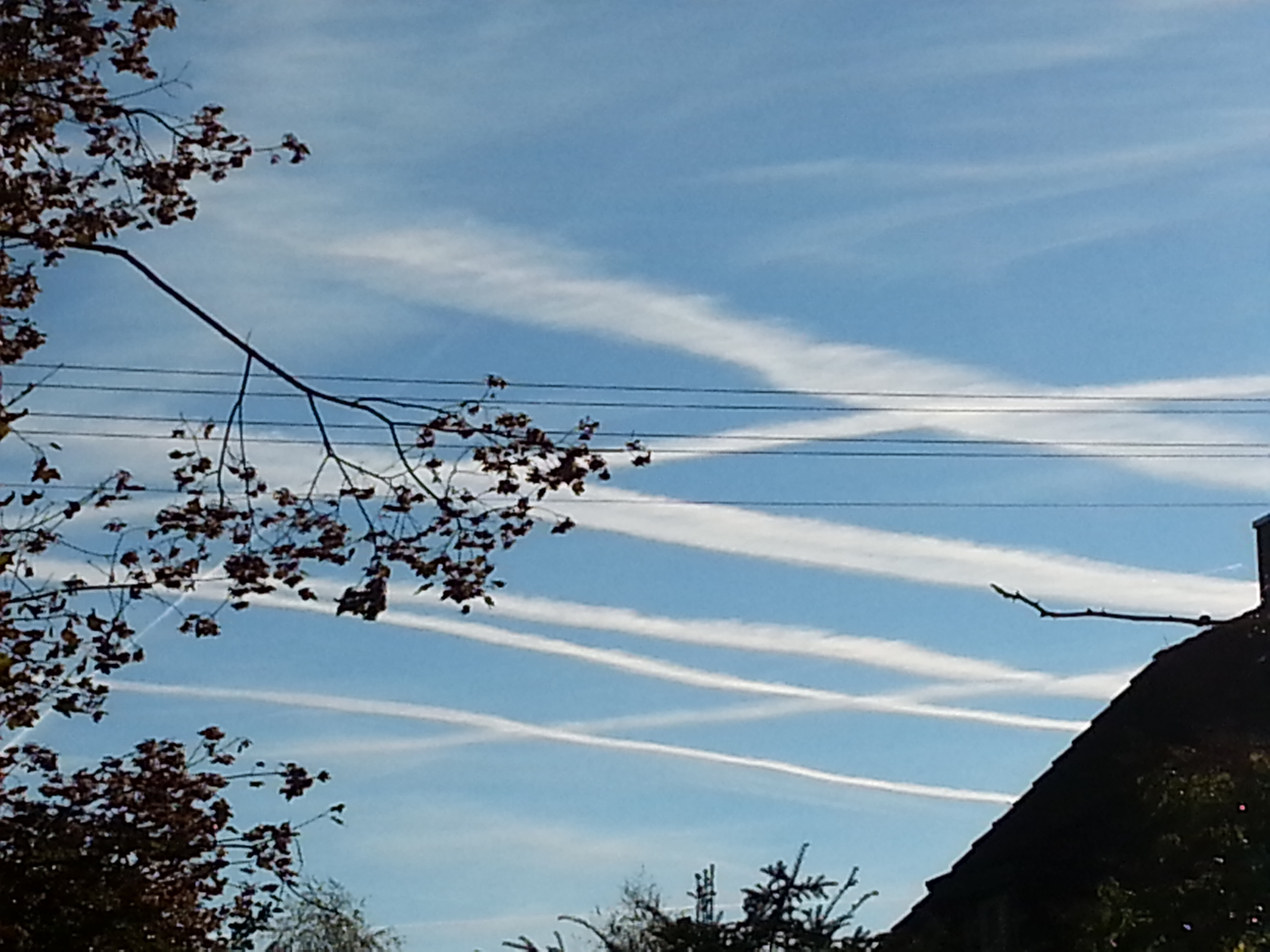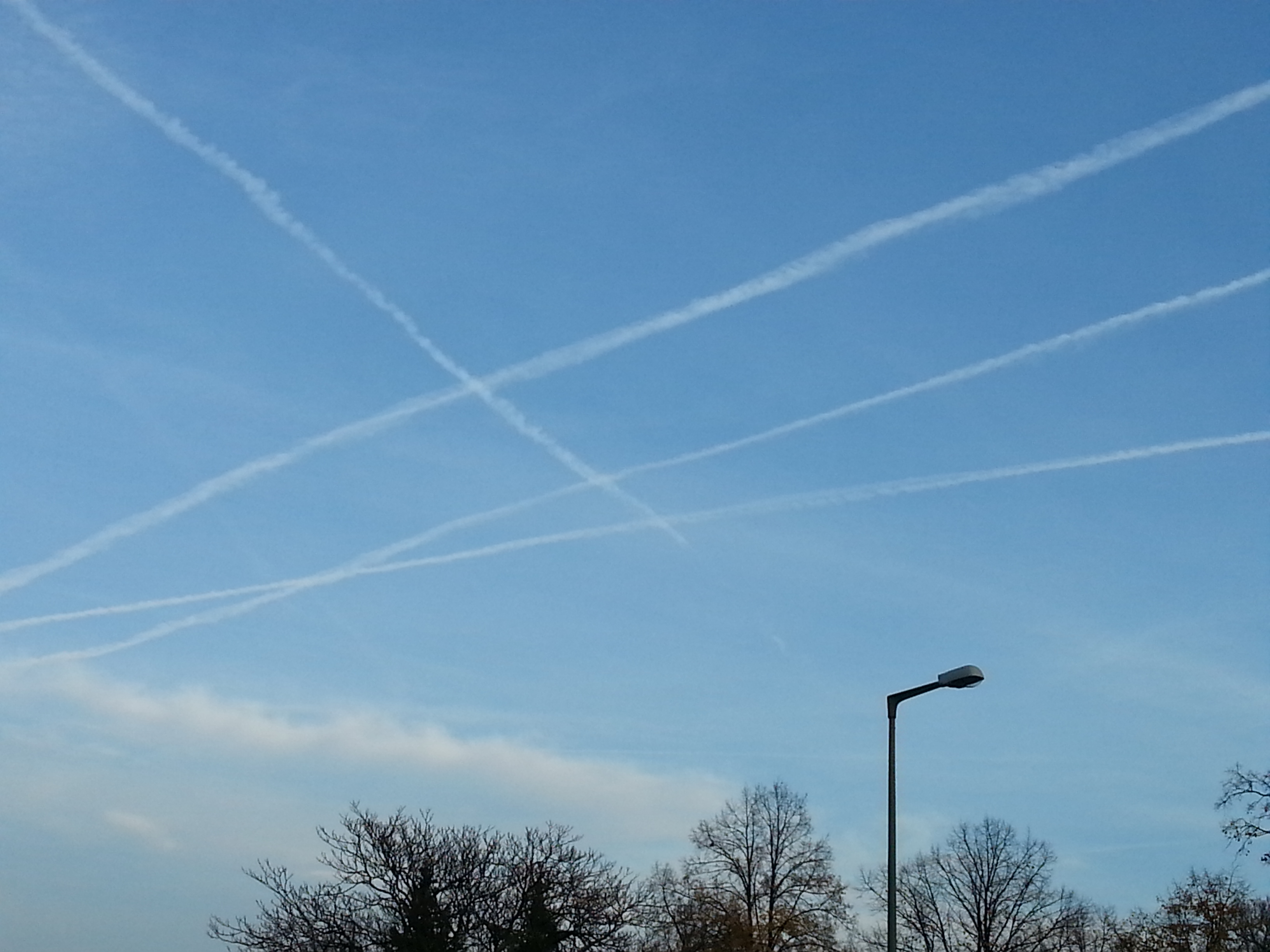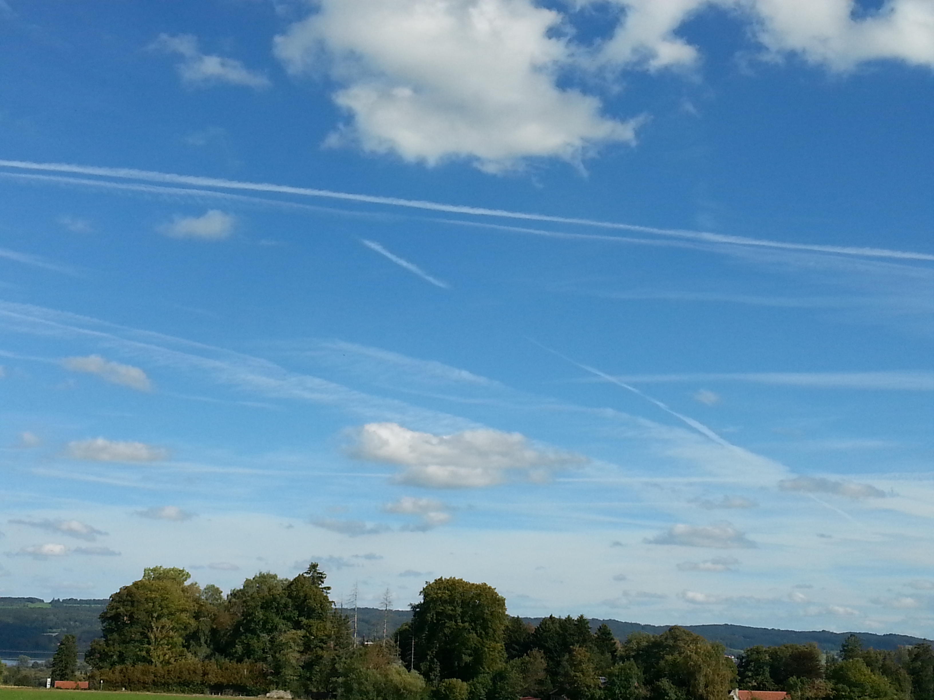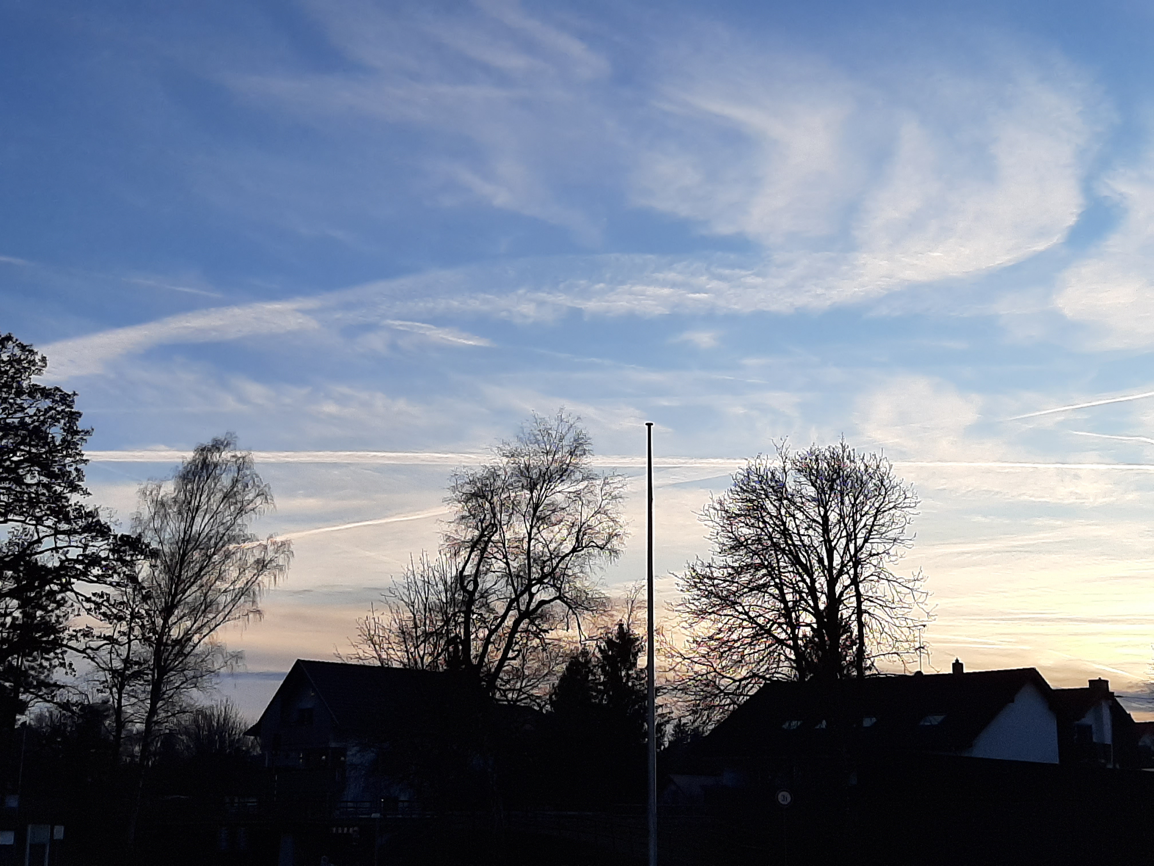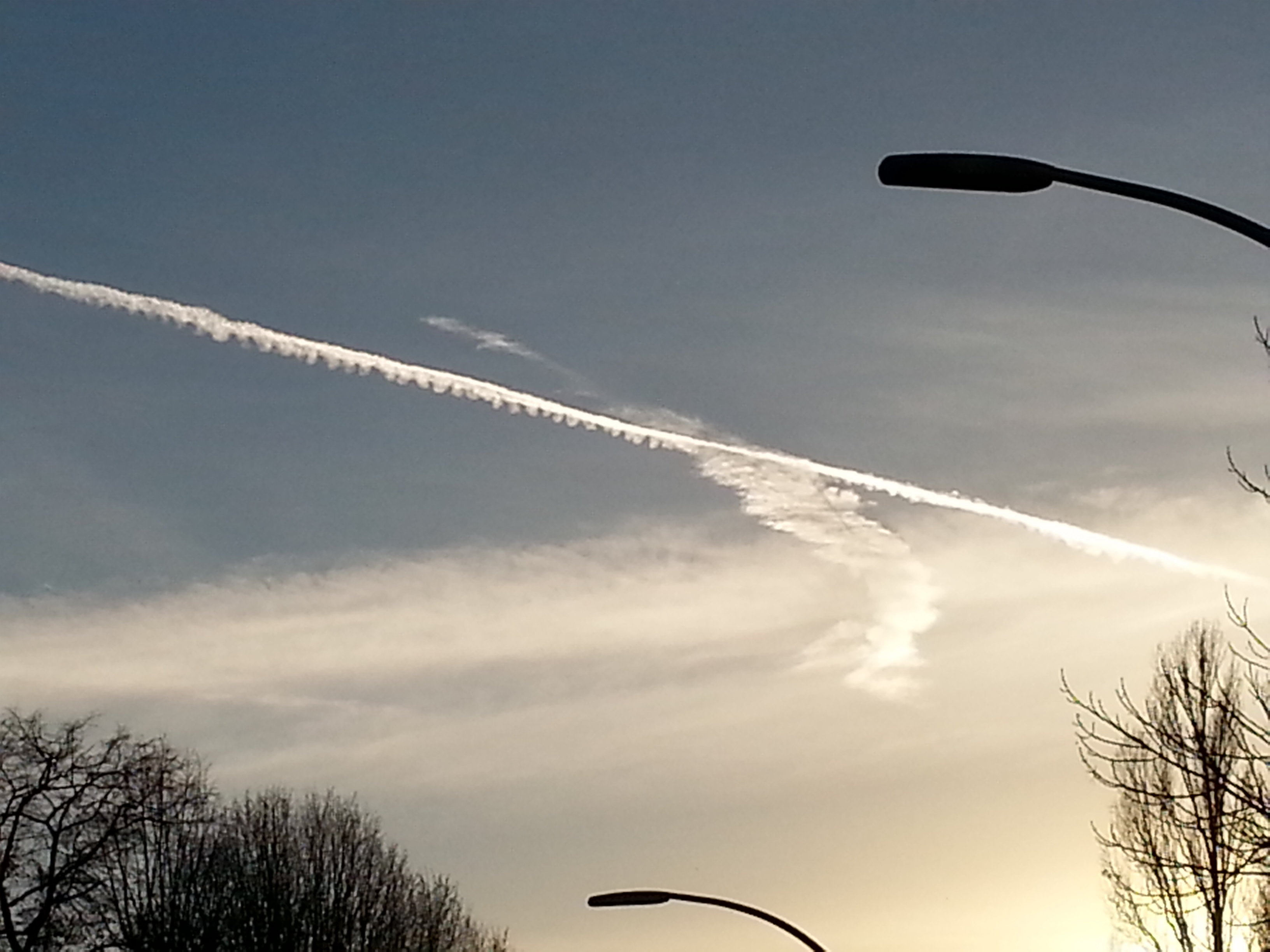 Weil durch Climate Change die Temperaturdifferenz zwischen Äquator und Nordpol geringer geworden ist, gibt es in den oberen Luftregionen sehr viel schwächere Höhenwinde.* Dadurch bleiben die Kondensstreifen, entstehend aus dem Kerosin der Flugzeuge, länger stehen und überlagern sich oft über Stunden. (1. Mai 2020, Corona Lockdown: Seit fünf Wochen sind kaum Himmelsbilder zu sehen.) Und warum wurde die Temperaturdifferenz zwischen Äquator und Nordpol geringer? Weil der CO2-Ausstoß aus dem Kerosin der Flugzeuge eine wichtige Ursache des Climate Change ist.