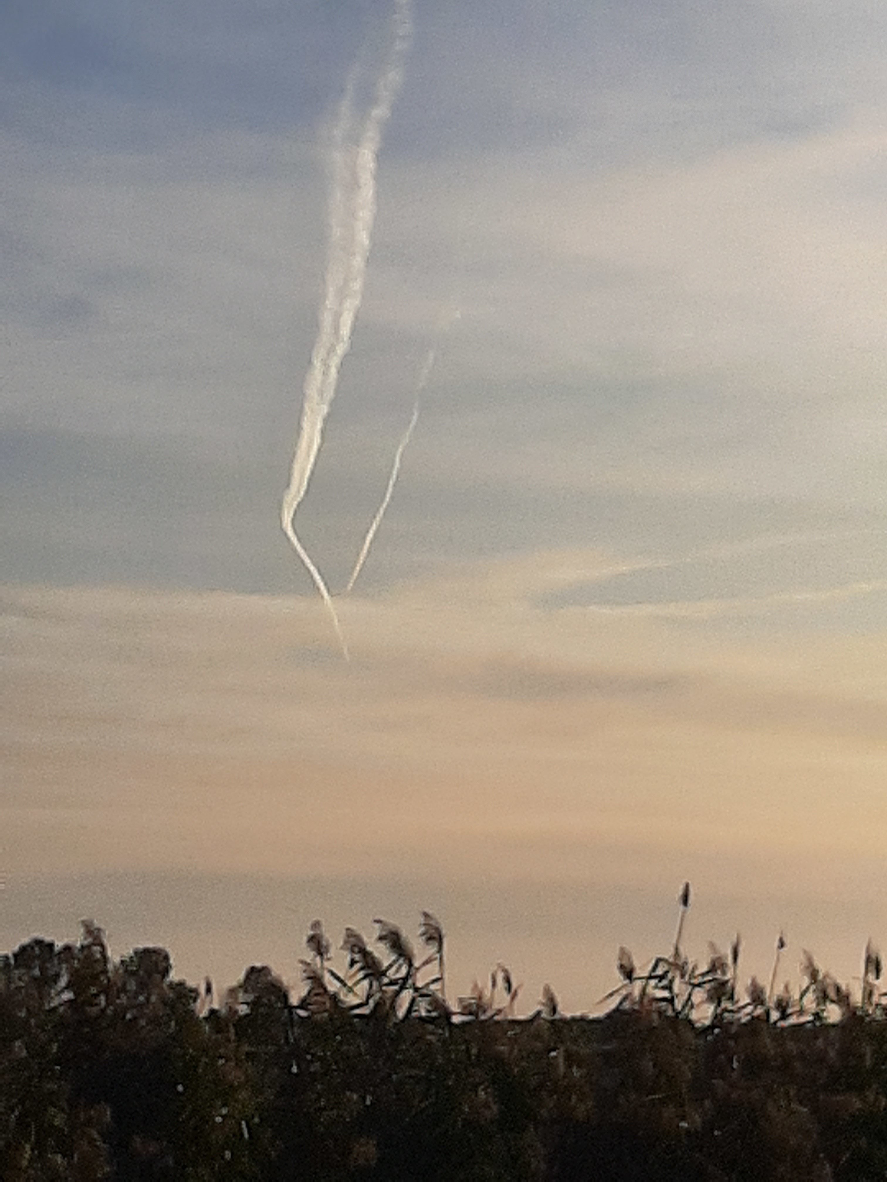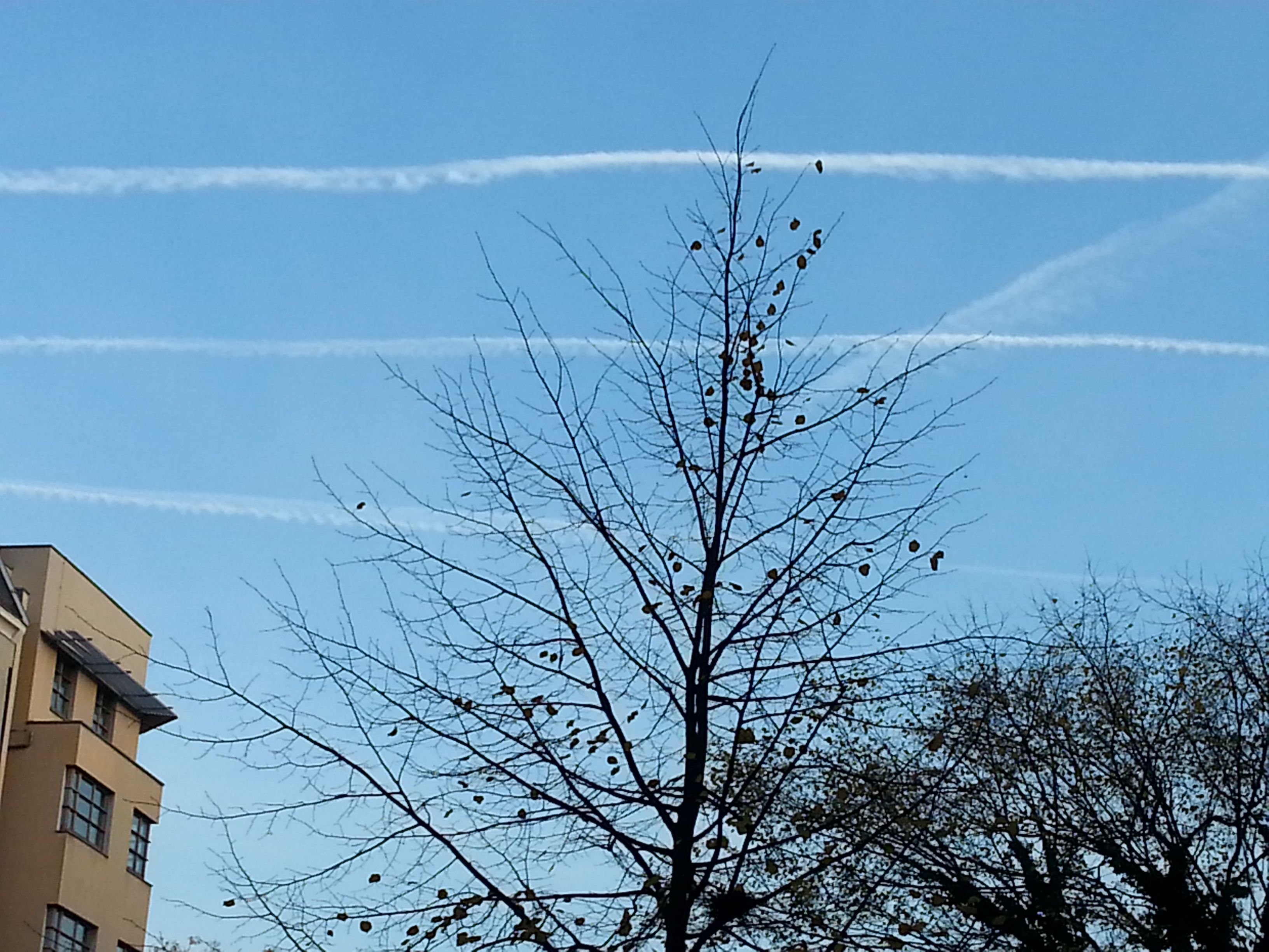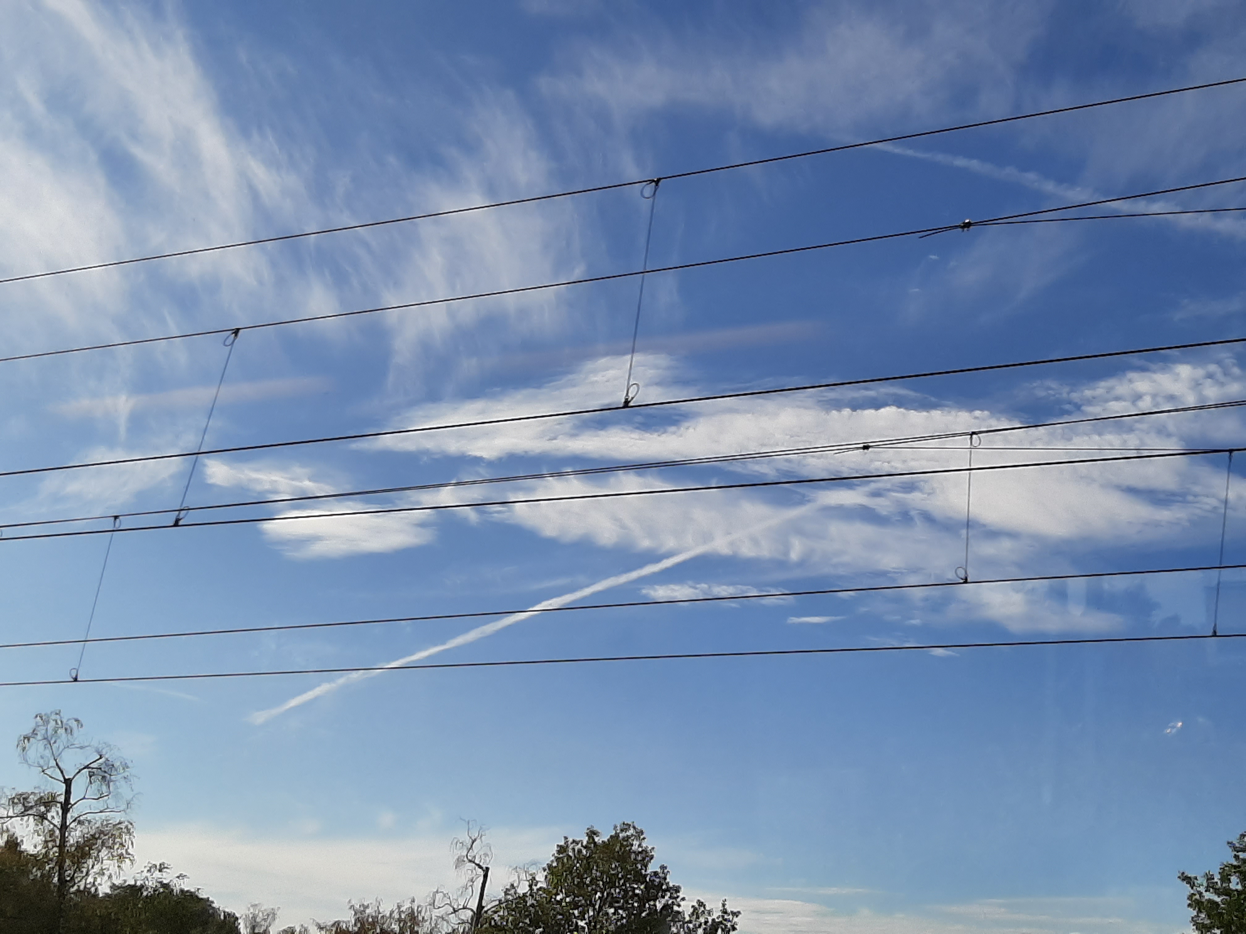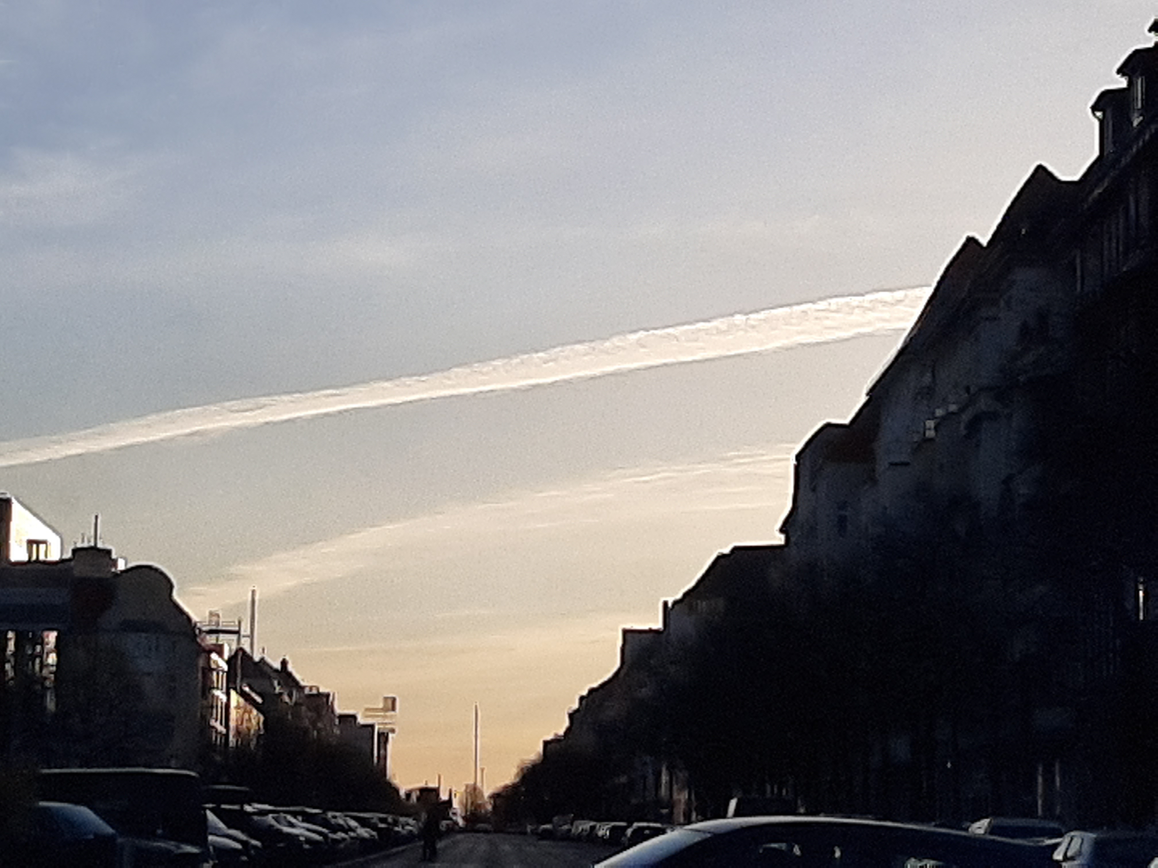 Weil durch Climate Change die Temperaturdifferenz zwischen Äquator und Nordpol geringer geworden ist, gibt es in den oberen Luftregionen sehr viel schwächere Höhenwinde.* Dadurch bleiben die Kondensstreifen, entstehend aus dem Kerosin der Flugzeuge, länger stehen und überlagern sich oft über Stunden. (1. Mai 2020, Corona Lockdown: Seit fünf Wochen sind kaum Himmelsbilder zu sehen.) Und warum wurde die Temperaturdifferenz zwischen Äquator und Nordpol geringer? Weil der CO2-Ausstoß aus dem Kerosin der Flugzeuge eine wichtige Ursache des Climate Change ist.