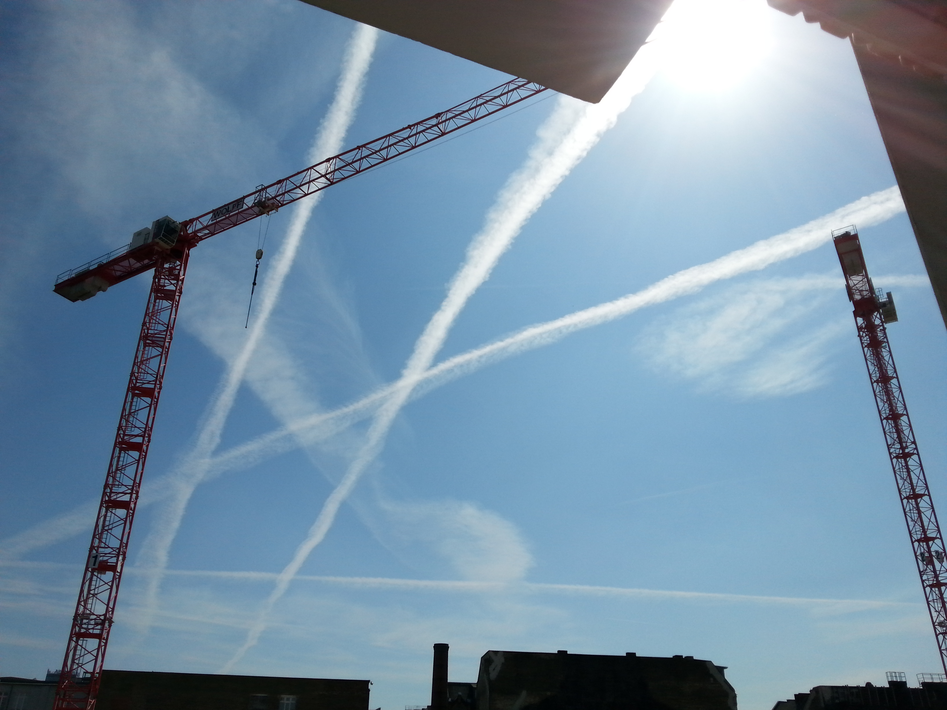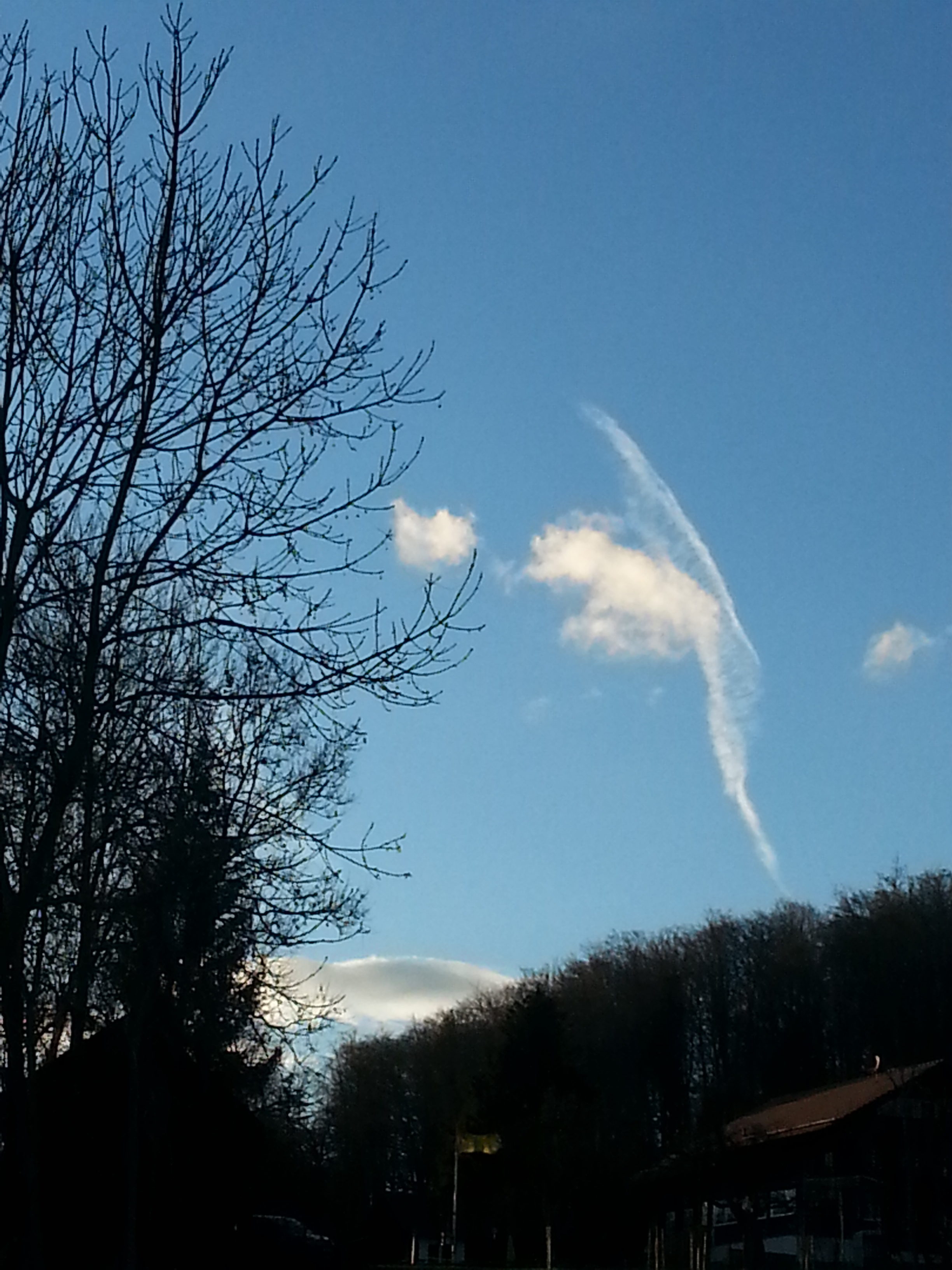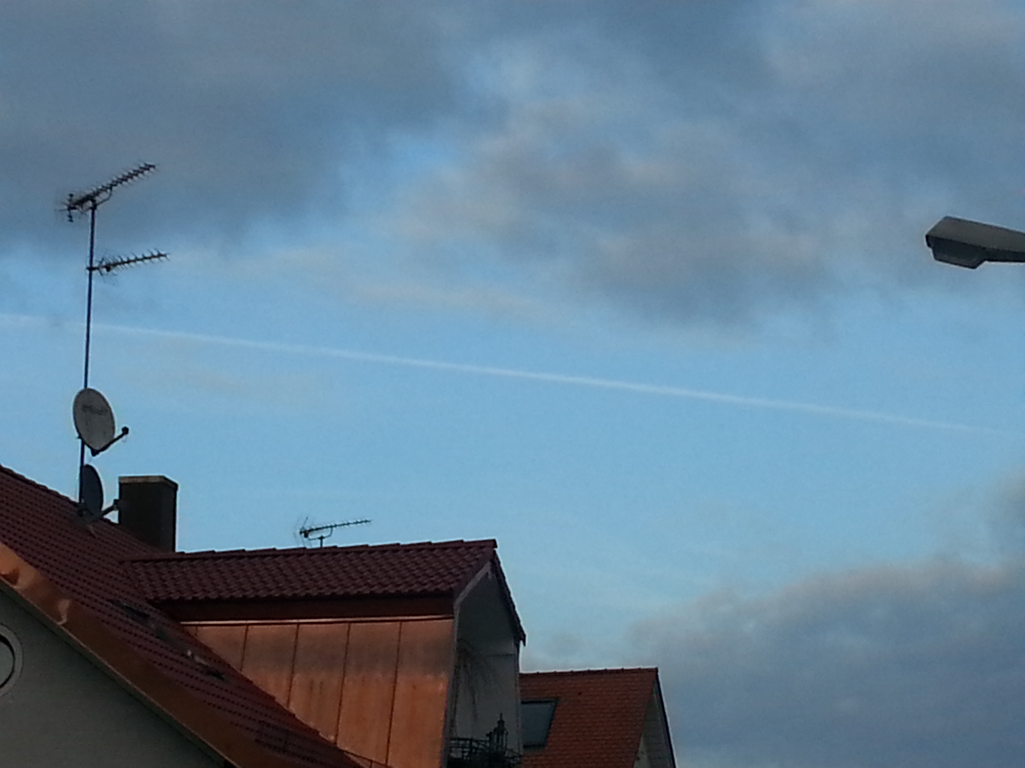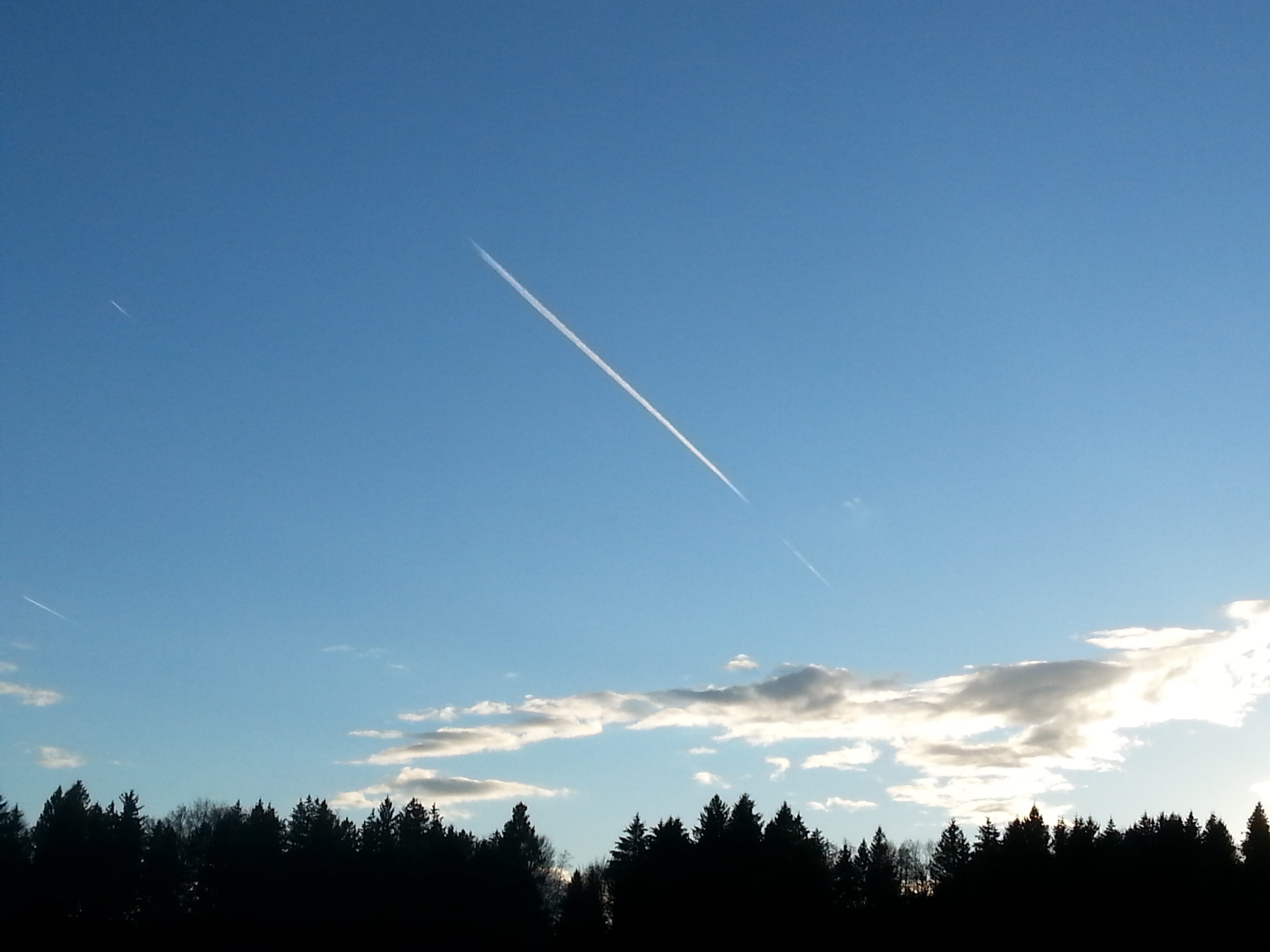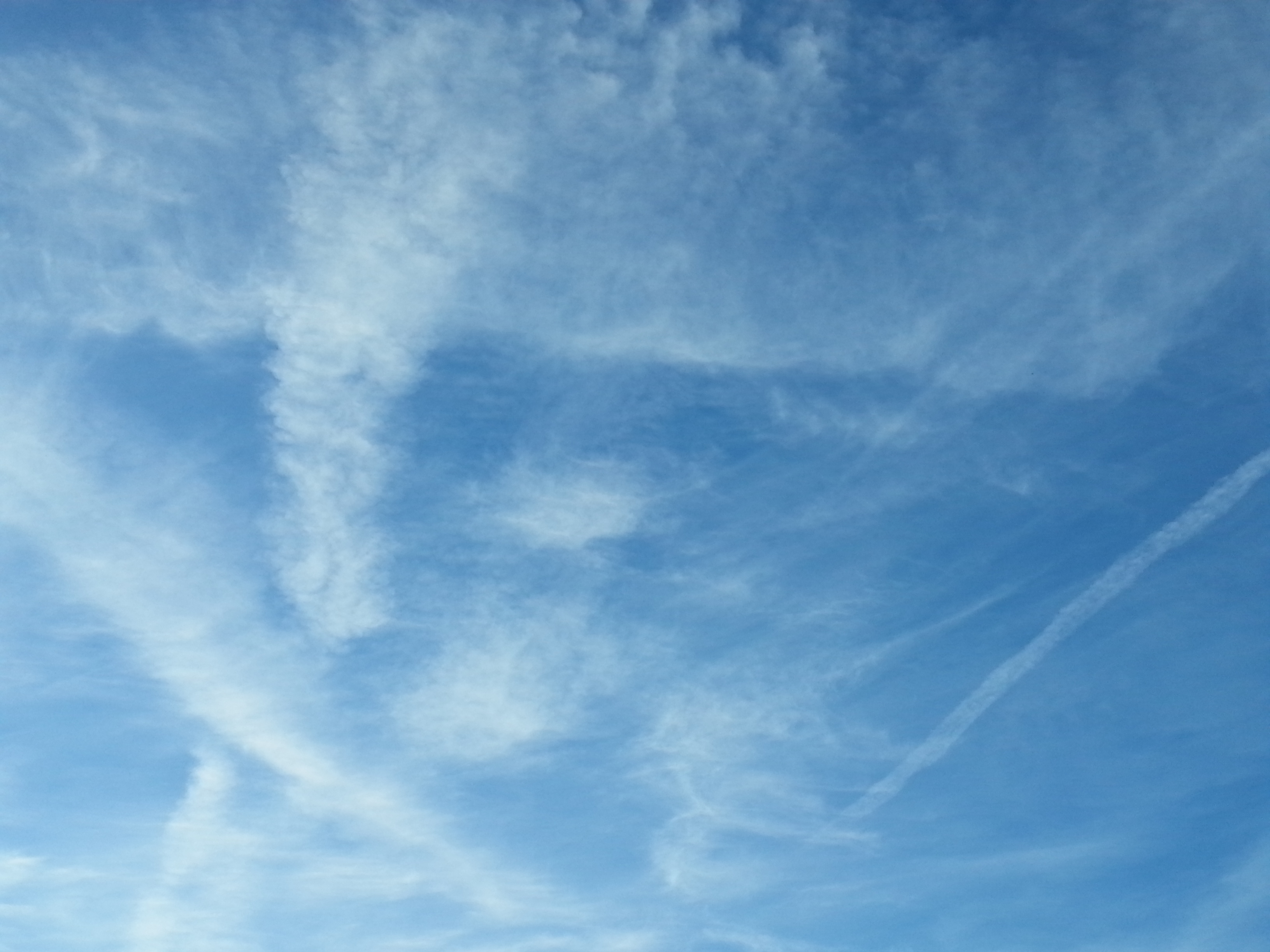 Weil durch Climate Change die Temperaturdifferenz zwischen Äquator und Nordpol geringer geworden ist, gibt es in den oberen Luftregionen sehr viel schwächere Höhenwinde.* Dadurch bleiben die Kondensstreifen, entstehend aus dem Kerosin der Flugzeuge, länger stehen und überlagern sich oft über Stunden. (1. Mai 2020, Corona Lockdown: Seit fünf Wochen sind kaum Himmelsbilder zu sehen.) Und warum wurde die Temperaturdifferenz zwischen Äquator und Nordpol geringer? Weil der CO2-Ausstoß aus dem Kerosin der Flugzeuge eine wichtige Ursache des Climate Change ist.