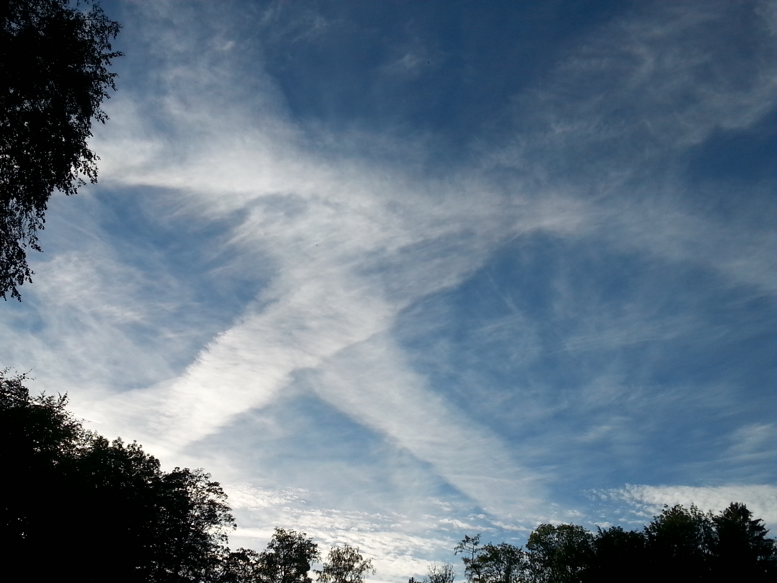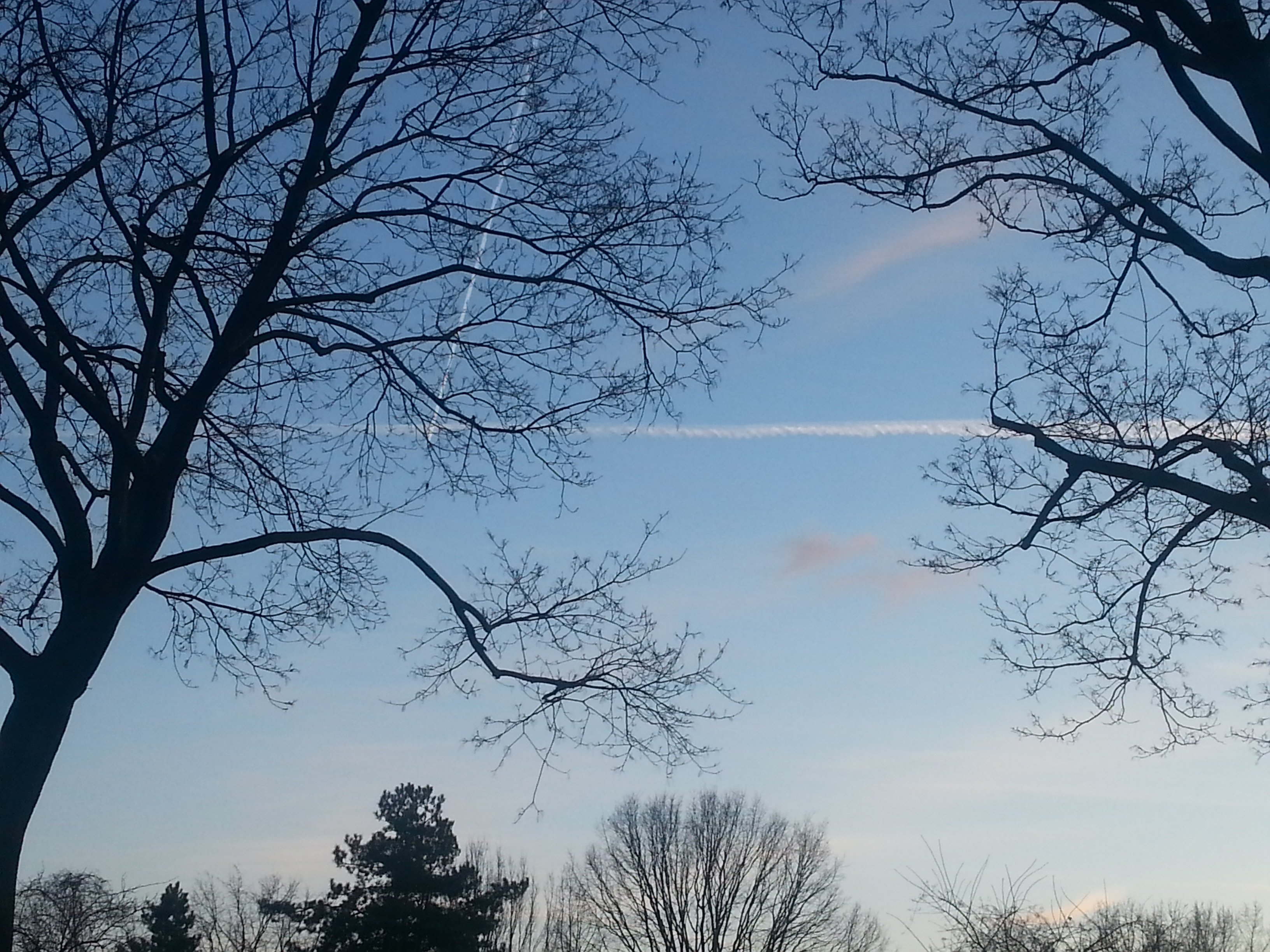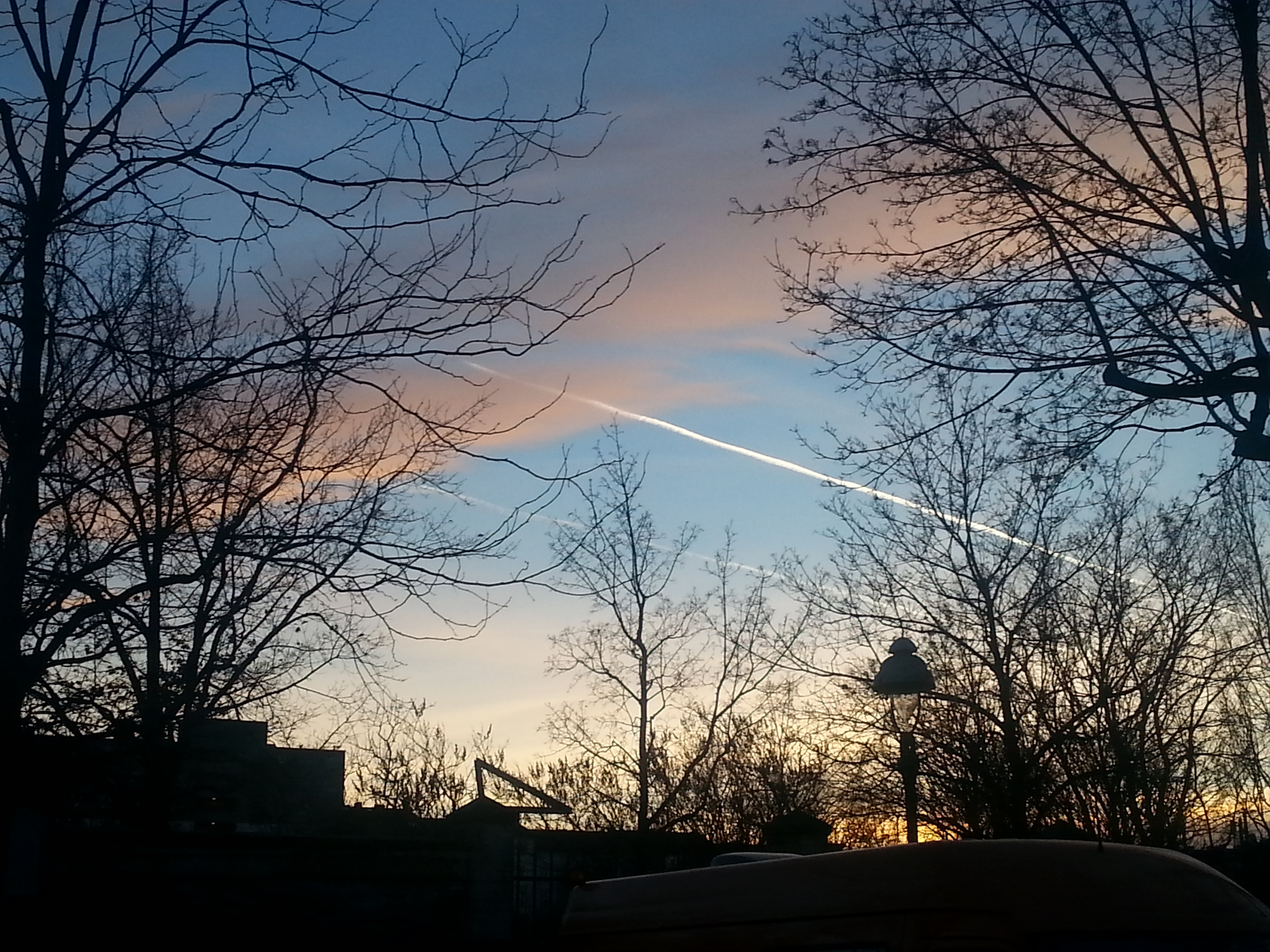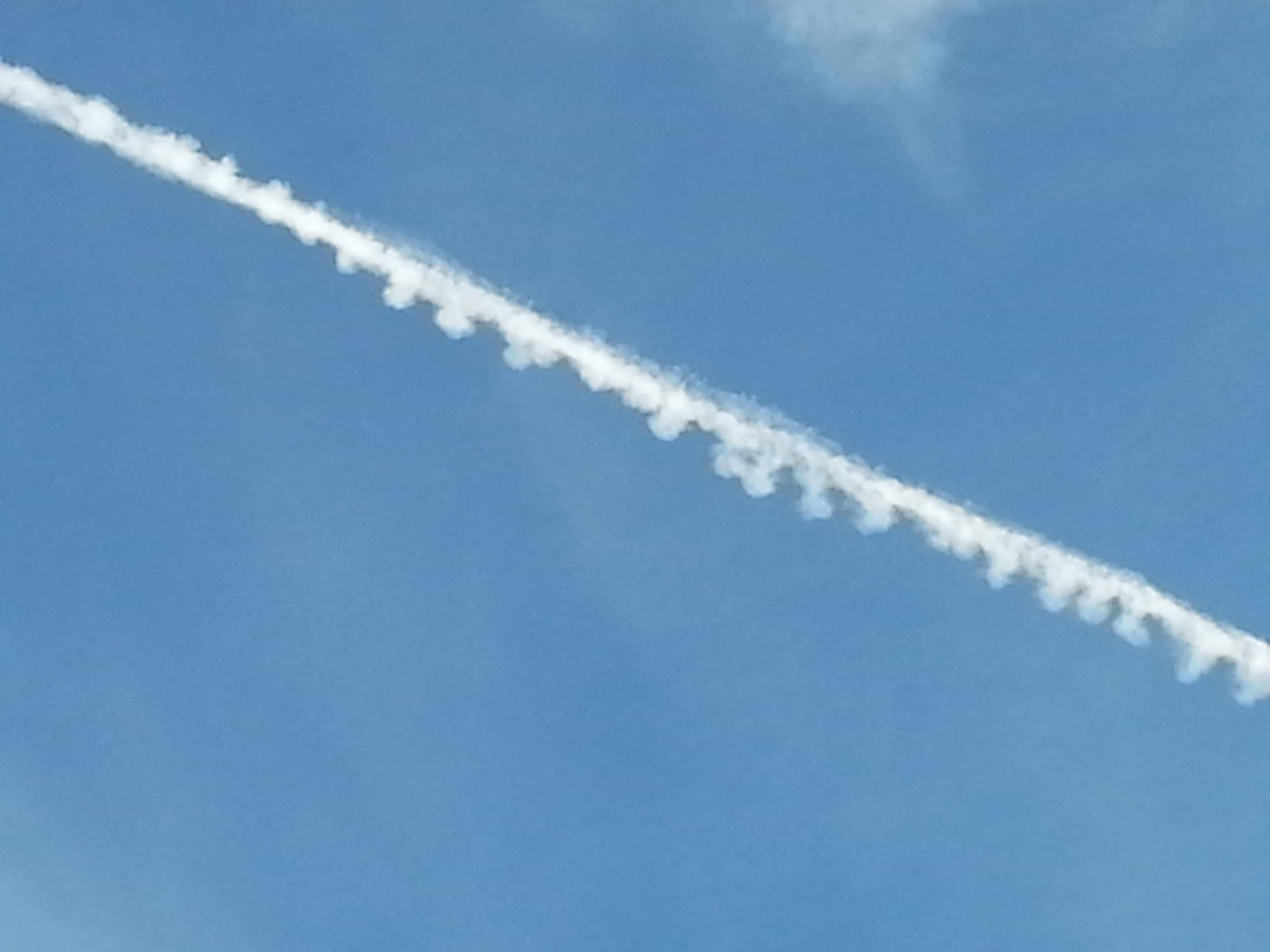 Weil durch Climate Change die Temperaturdifferenz zwischen Äquator und Nordpol geringer geworden ist, gibt es in den oberen Luftregionen sehr viel schwächere Höhenwinde.* Dadurch bleiben die Kondensstreifen, entstehend aus dem Kerosin der Flugzeuge, länger stehen und überlagern sich oft über Stunden. (1. Mai 2020, Corona Lockdown: Seit fünf Wochen sind kaum Himmelsbilder zu sehen.) Und warum wurde die Temperaturdifferenz zwischen Äquator und Nordpol geringer? Weil der CO2-Ausstoß aus dem Kerosin der Flugzeuge eine wichtige Ursache des Climate Change ist.